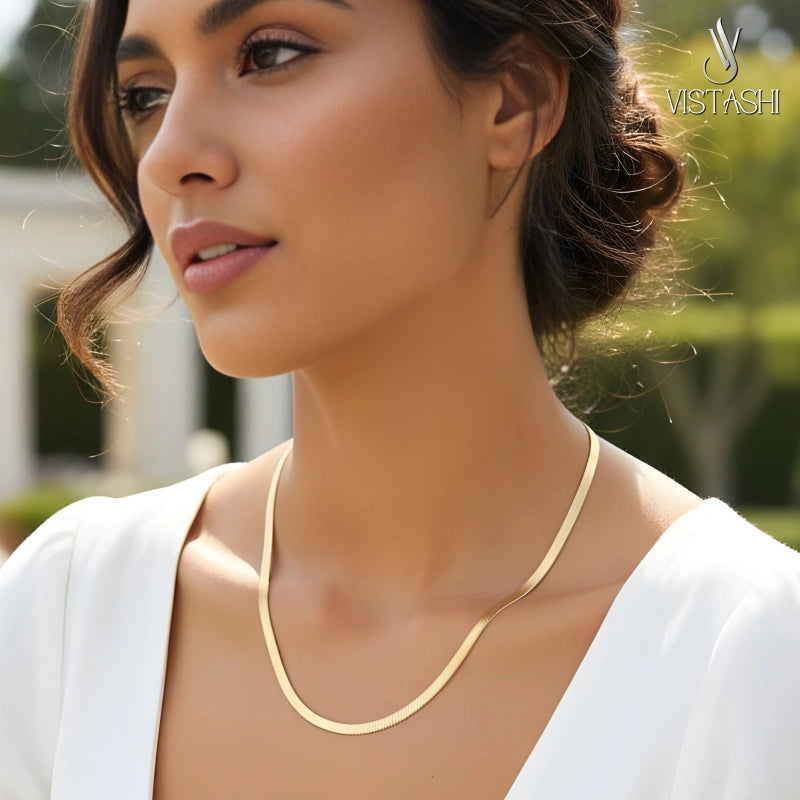 Wear it solo for a minimal, polished look, or layer it with pendants for a modern, stacked aesthetic. Whether you’re dressing up for an event or adding subtle shine to your daily outfit, the Vistashi Snake Chain is your timeless go-to.