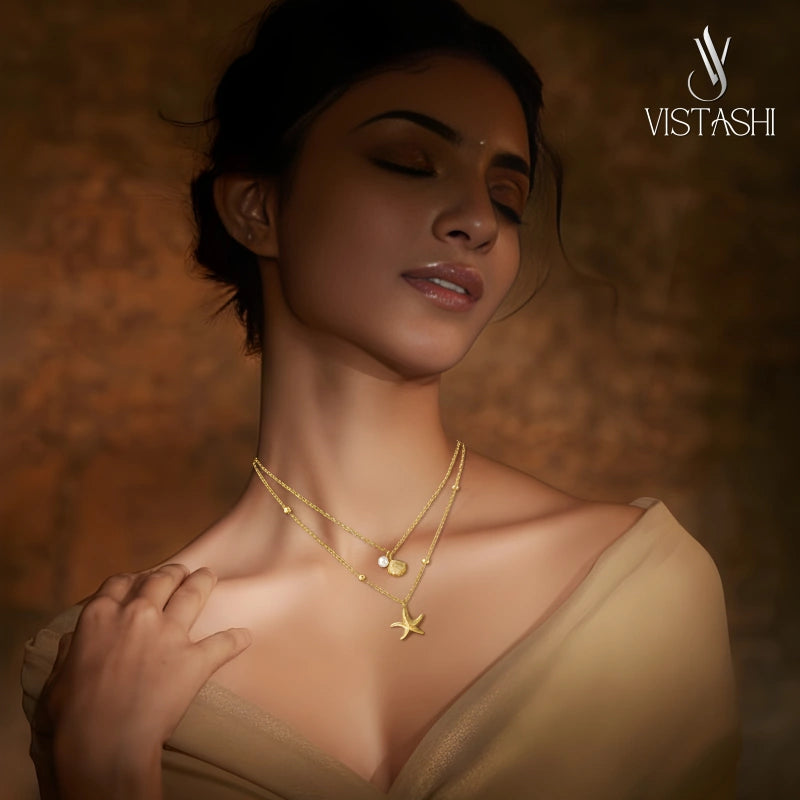 Inspired by the celestial beauty of the night sky, the Vistashi Gold Plated Star Themed Pendant is designed to remind you to shine in your own light. A symbol of hope, dreams, and infinite possibilities, this pendant beautifully captures the essence of modern elegance and timeless sentiment.